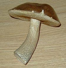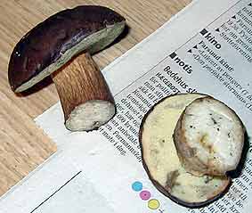 | | English Name: Bay Bolete | | Norwegian Name: Svartbrun rørsopp | | Latin Name: Xerocomus badius, Bolétus bádius | | This is one of my favorites of the bolete family. They are fairly easy to identify because of the blue-green bruising when cut or handled. They are also one of the last ones to be bothered by bugs. If you want to see the biggest mushroom(680 gram) I've ever found of this kind, click here! | |